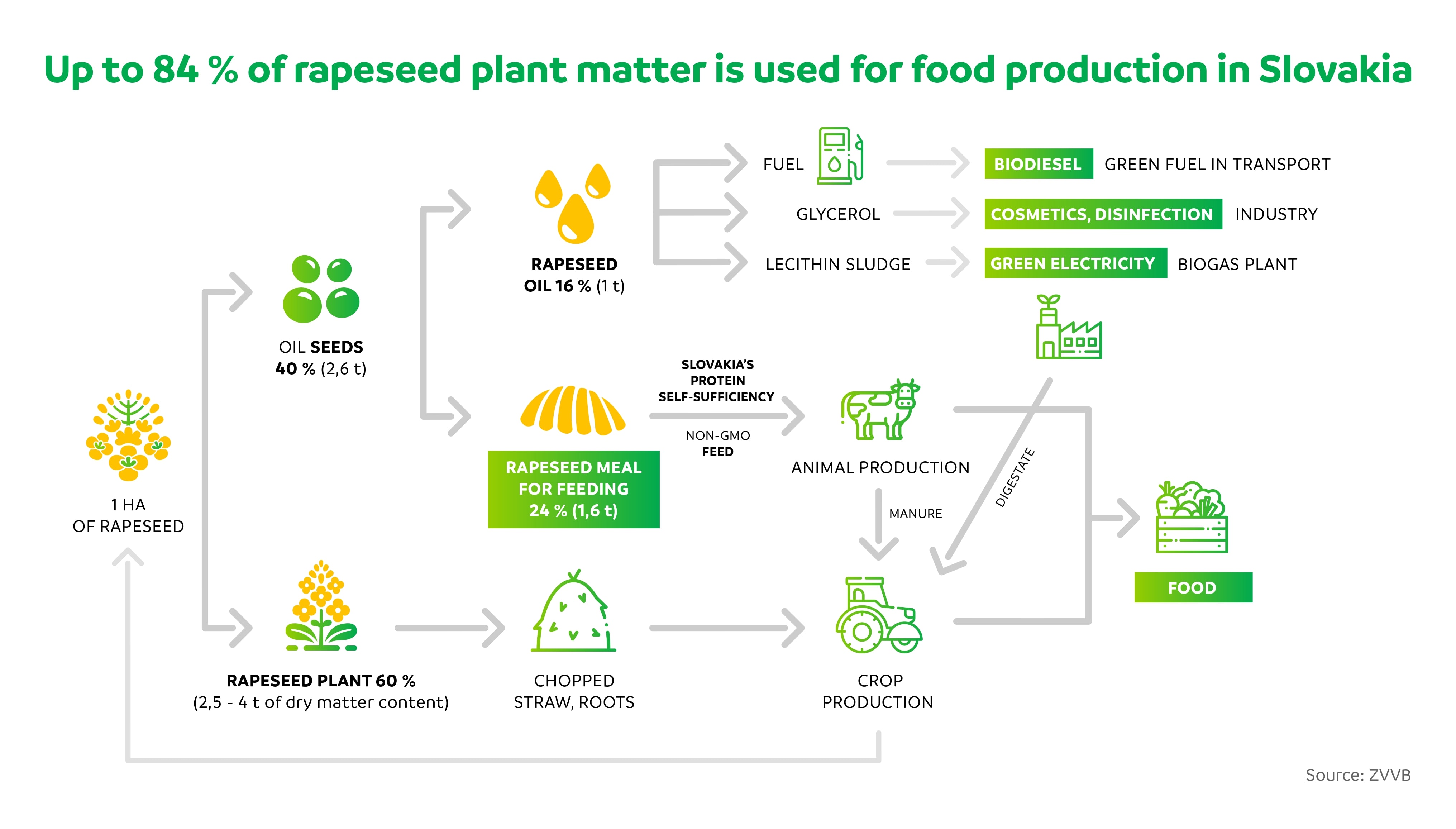Only a small part of the rapeseed plant is used for biodiesel production. After oil pressing, more than 50% of the processed mass remains in the form of rapeseed meal (with a high protein content – up to 35%). This locally produced feed (suitable for all livestock thanks to the balanced ratio of nutrients) can effectively replace imported (mostly GMO) soybean meal. Although this is almost unknown to the public, in this way biofuel production contributes significantly to the EU's protein self-sufficiency. At the same time, currently there is important research underway to evaluate the use of proteins of rapeseed origin even in human nutrition.